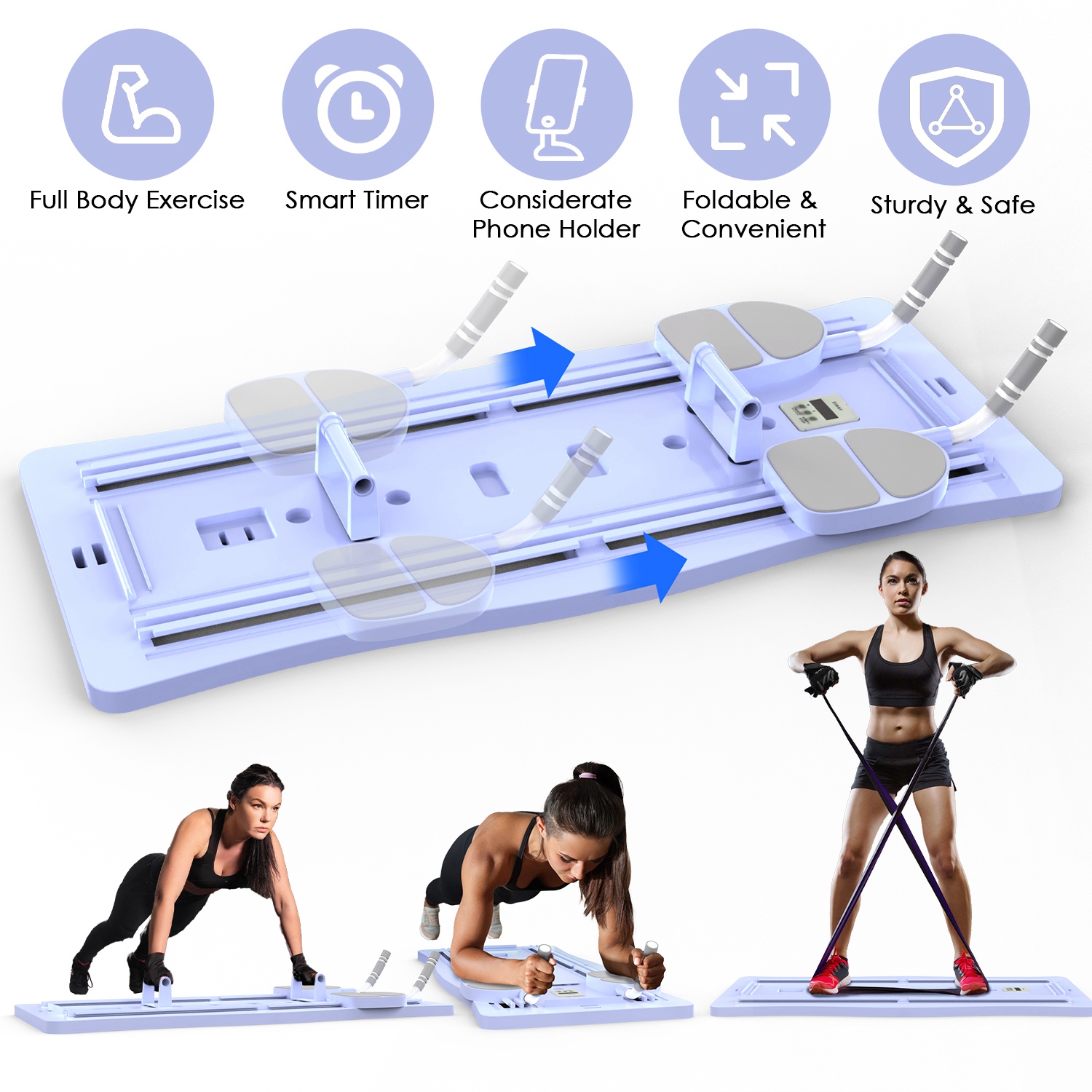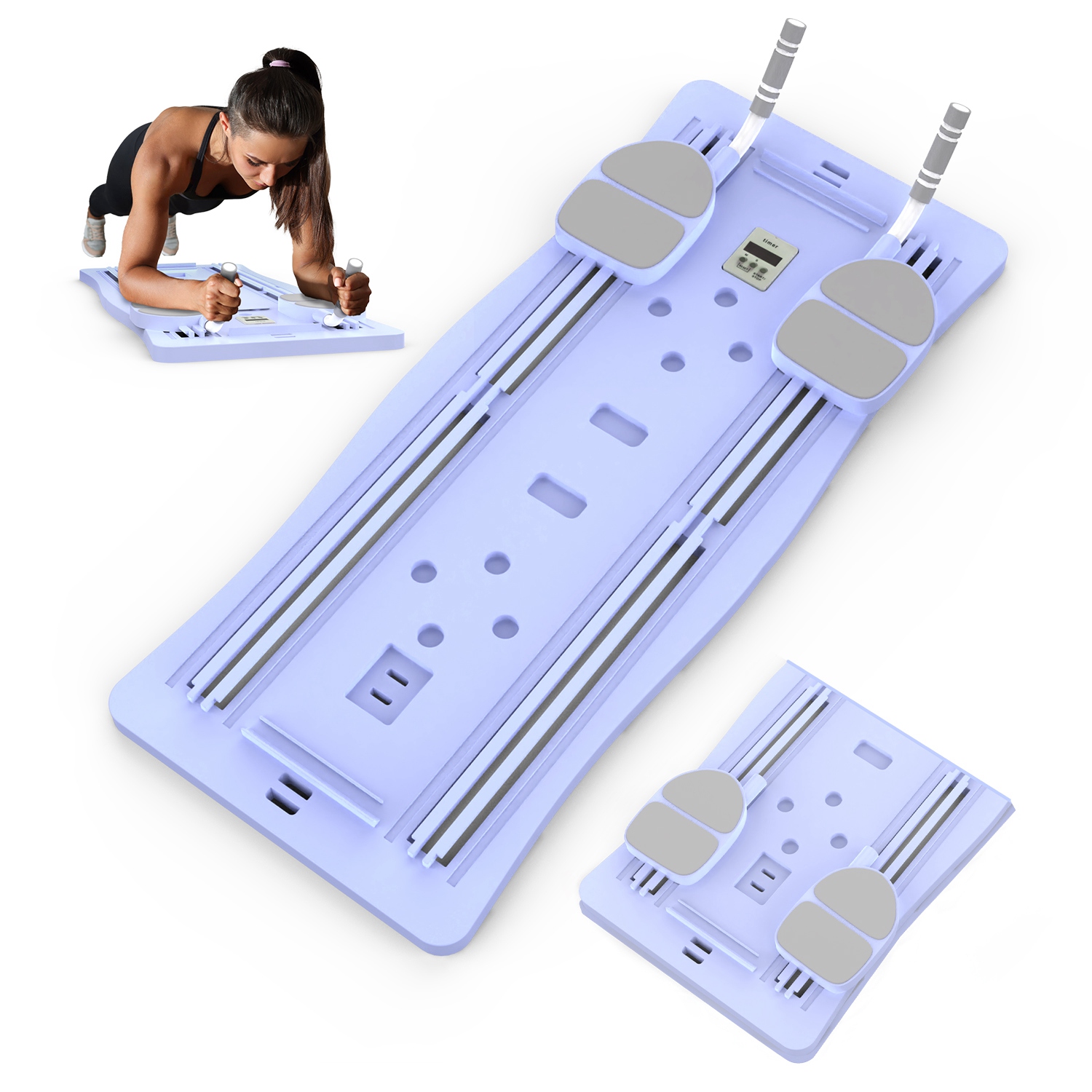 Home > 4 In 1 Foldable Pilates Reformer Sliding Board Exercise Board for Home Pilates Equipment Set with Timer Phone Holder 2 Resistance Bands
