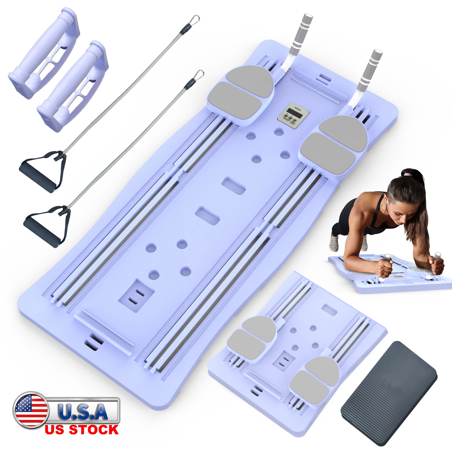 From sliding board exercises to resistance band workouts, this Pilates reformer functions as an Ab wheel, plank board, resistance bands and push-up bars, targeting training of your core, arms, legs, and back etc.. Built in a timer and phone holder to keep you motivated. Sturdy enough to hold up to 330lbs weight. Provide a kneel pad, non-slip elbow pads, bottom foot pads, ergonomic hand grips to keep you comfortable and safe. Foldable and easy to assemble. An ideal gift for people who loves working out!