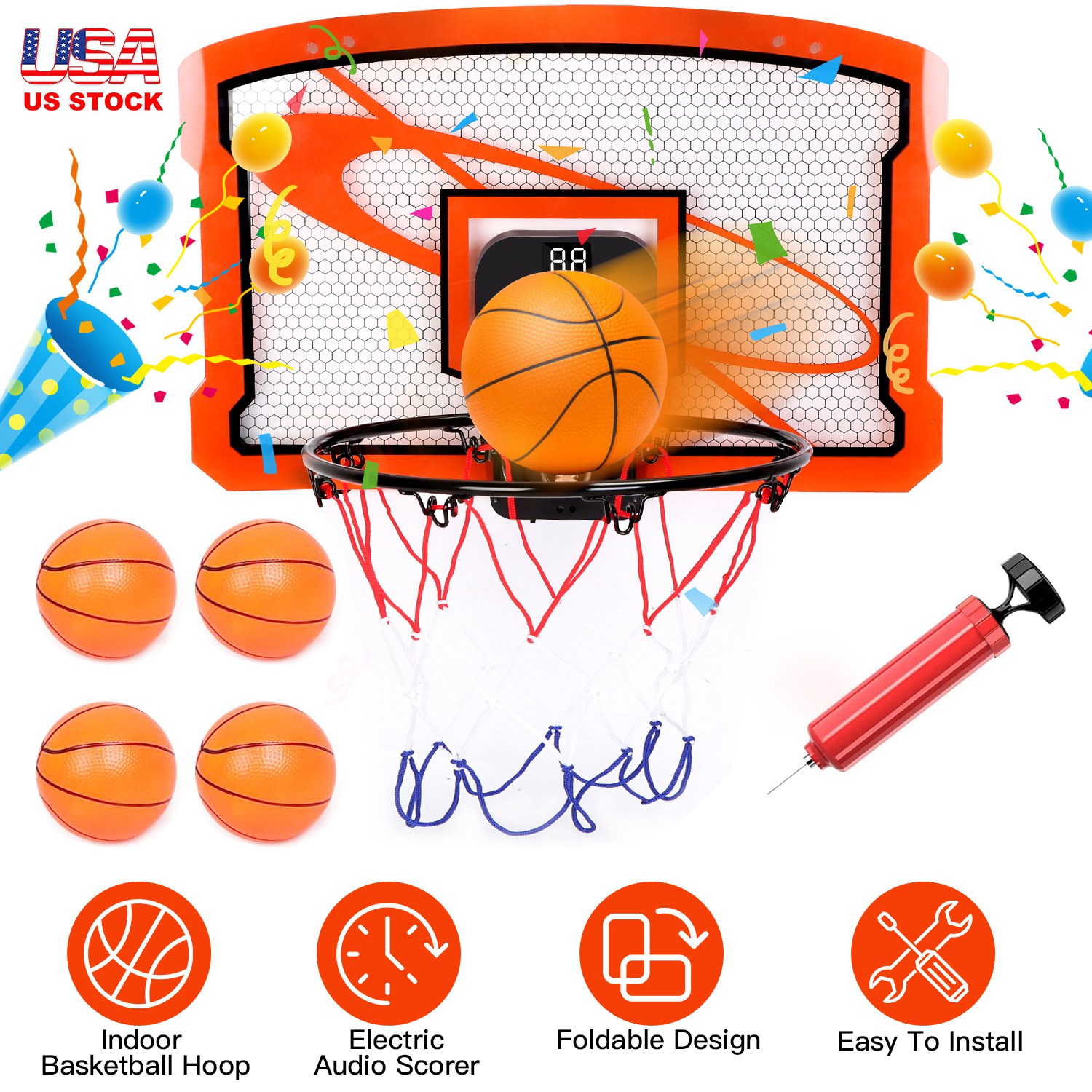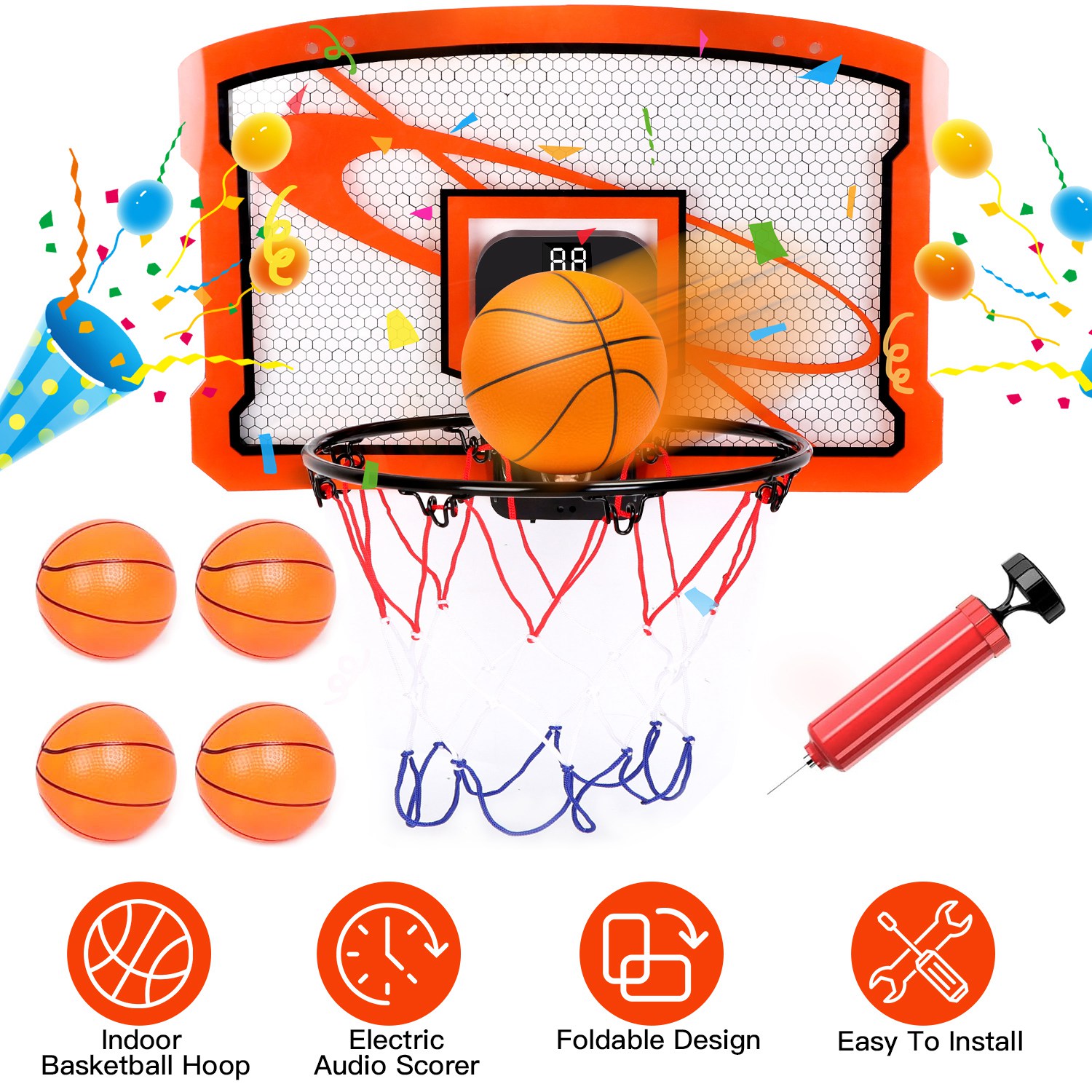 Home > Indoor Mini Basketball Hoop Set Over Door Basketball Hoop with 4 Inflatable Balls Electric Audio Scorer Foldable Basket Gift for Kids and Adults