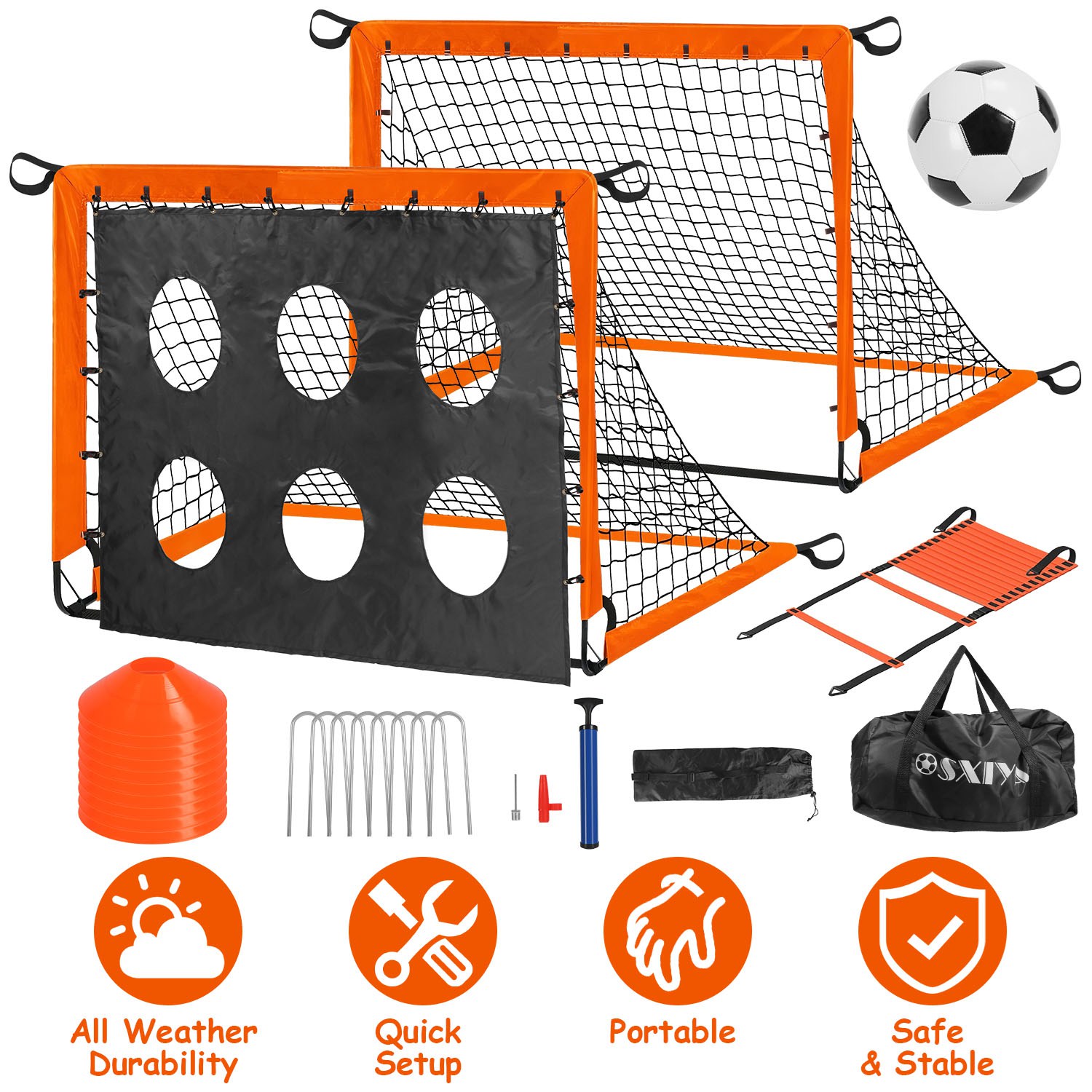 This comprehensive soccer training set includes two 6x4FT goals, a removable scoring target, an inflatable soccer ball, a pump, 10 marker cones, 8 ground nails, a carry bag, and an agility ladder—everything needed for engaging practice. The goals feature high-strength PE netting and 7mm fiberglass rods, supported by rust-resistant steel nails for stability. Easy to assemble in just two steps, the set is portable with a waterproof carry bag, ideal for backyard, beach, or playground use. Perfect for kids aged 3+, it fosters soccer interest, enhances skills, and promotes active play and social interaction. A great gift for fun, fitness, and family bonding.