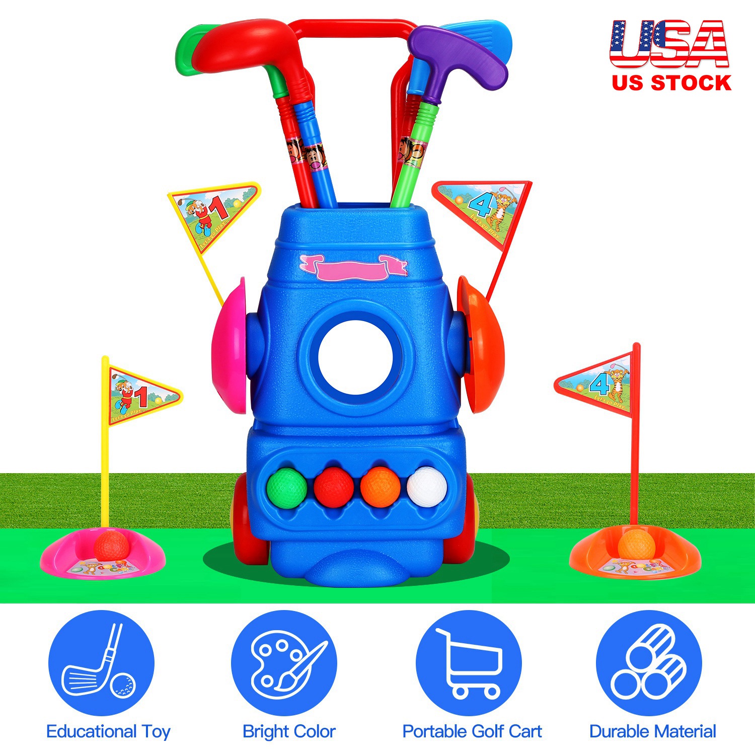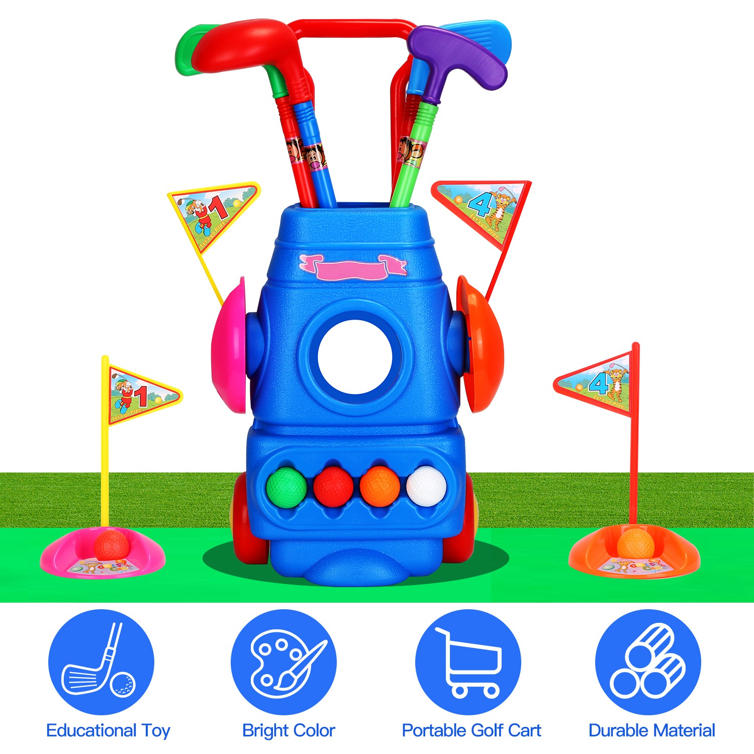 Toddler Golf Set with 4 Balls 4 Clubs 2 Holes 2 Flags Golf Cart Indoor Outdoor Golf Game Gift For 3-5 Years Old Kids